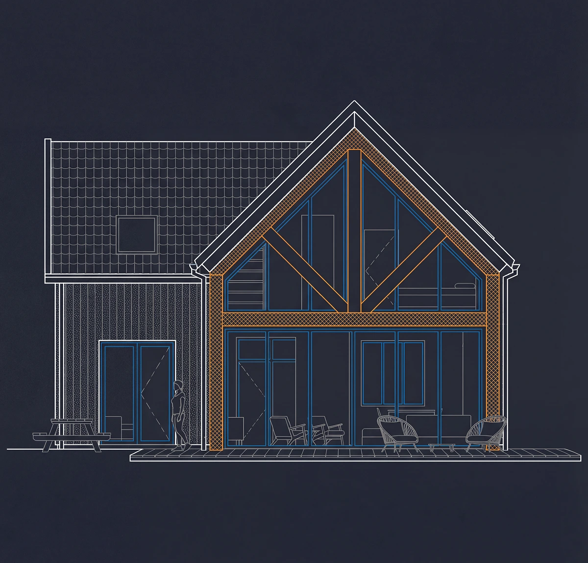 We maken een eerste schetsontwerp op basis van jouw wensen en houtbouwprincipes.